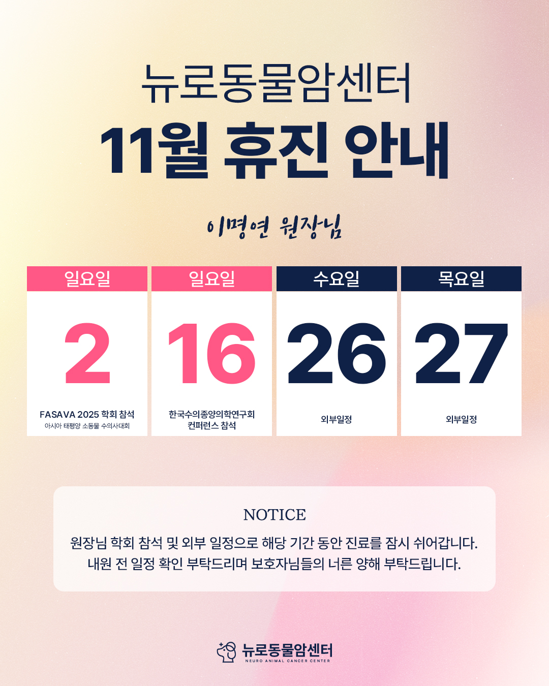 * 진료시간 외 응급진료의 경우, 2층 뉴로동물의료센터24시로 내원부탁드립니다.